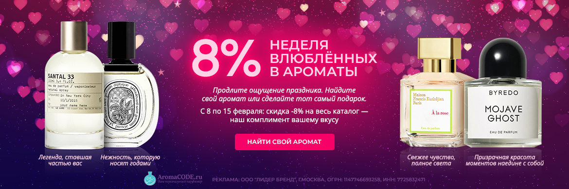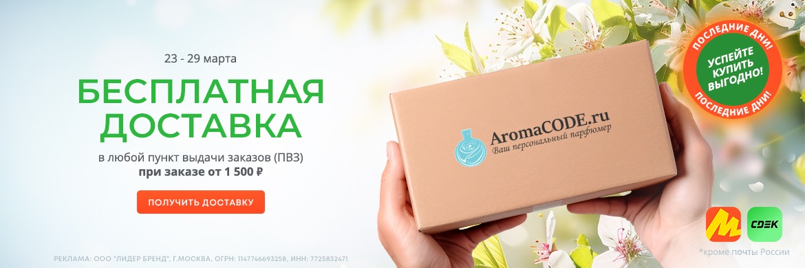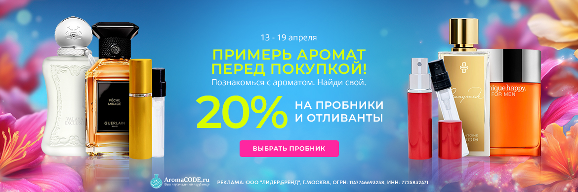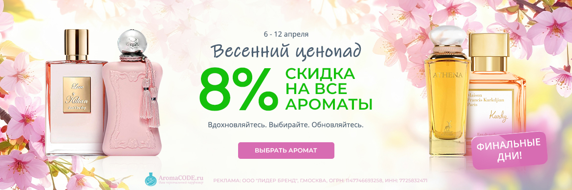 Онлайн-магазин Aromacode — поставщик оригинальной парфюмерии для женщин и мужчин, а также нишевых ароматов для ценителей нестандартных ольфактивных впечатлений. Мы продаем парфюмы известных брендов: Dolce & Gabbana, Lancome, Gucci, Chanel, Hugo Boss и других. Наряду с духами, парфюмированной и туалетной водой в каталоге есть тестеры и отливанты для ознакомления с новыми запахами.